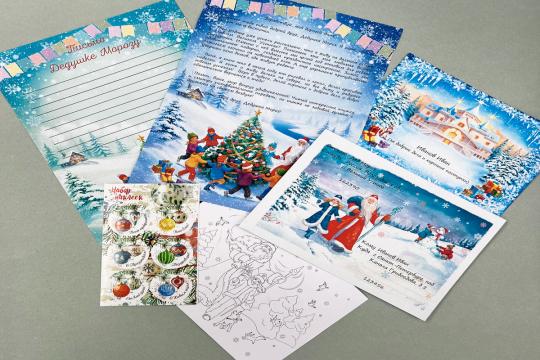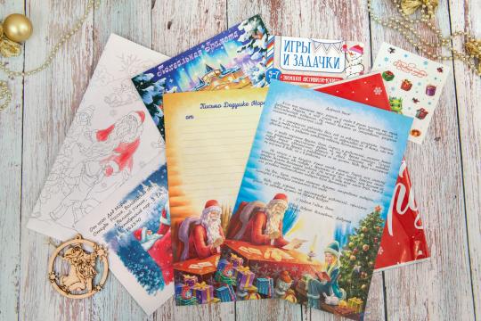 Предметов 6: Конверт, Раскраска формата А3, Письмо от Дедушки Мороза, Новогодние наклейки, Обратное письмо для Дедушки Мороза, Грамота поздравительная