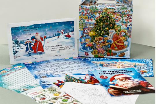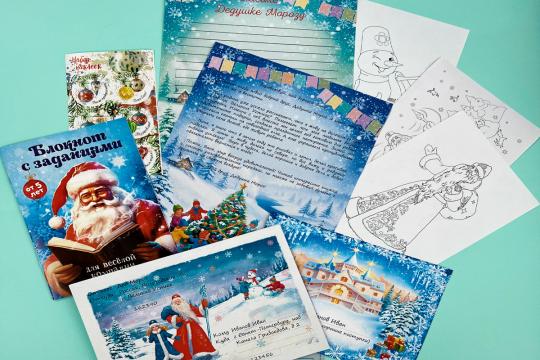 Предметов 7: Конверт, Книжка (по возрасту), Раскраска формата А3, Письмо от Дедушки Мороза, Новогодние наклейки, Обратное письмо для Дедушки Мороза, Грамота поздравительная
